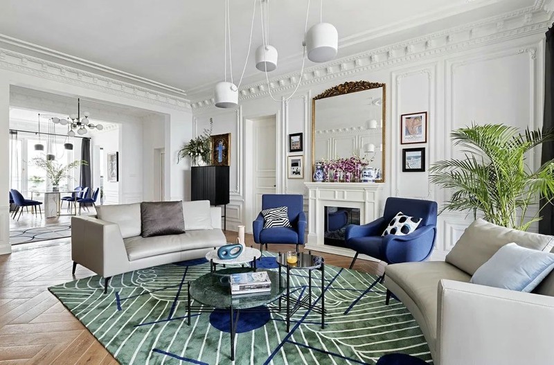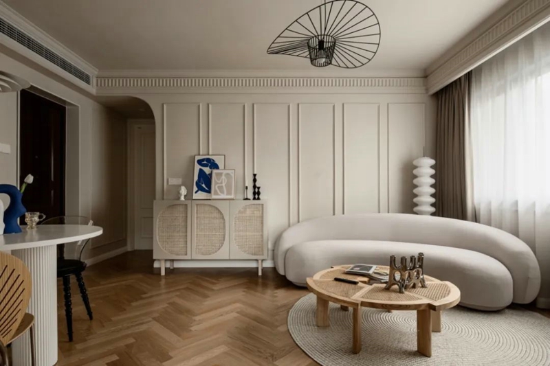 4.、拼花木地板 拼花木地板,是新法式高顏值的標準配置,常見的比如人字拼,魚骨拼等等各種拼花形式,加上木地板本身原木的自然溫潤,強化法式的浪漫、溫軟和舒適感受。