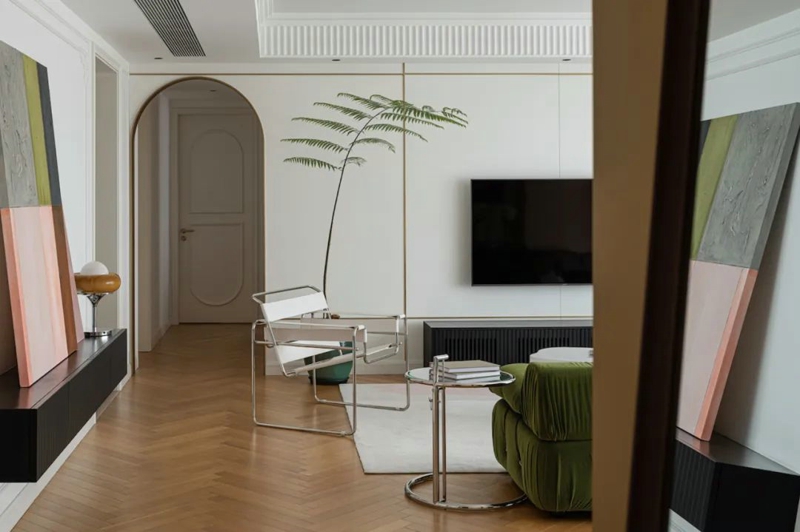 一些偏向復古風的新法式,還會采用低飽和度的綠色或者古紅色,來作為空間的點綴。